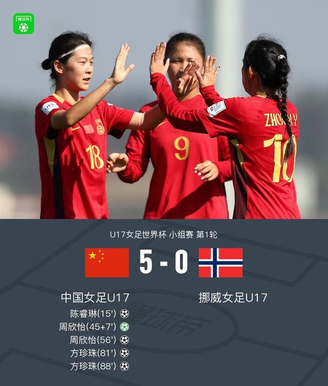 2024年U17女足世界杯小组赛首轮,中国U17足球队对阵挪威U17足球队。比赛开始后不久,陈瑞琳率先打破僵局,为中国队取得领先。上半场补时阶段,周心怡主罚点球进一步扩大比分优势。易边再战,周心怡再次建功,完成了自己的第二个进球。进入比赛最后阶段,方珍珠继续发力,两次破门,彻底追平比分。全场比赛结束,中国女足5-0战胜对手,取得赛事开门红。主赛事第16分钟,陈瑞林任意球直接射门,皮球击中正门。中国1-0挪威。第45分钟和第6分钟,中国队在禁区内创造了一个点球。周心怡主罚点球。中国2-0。我第56分钟,球从中路传出。周心怡得分完成双射。中国3-0挪威。第82分钟,周欣怡主罚点球。欣怡外脚背传中,方珍珠单刀再下一城。中国4-0挪威。第89分钟,方珍珠左路推射破门,梅开二度。中国5-0挪威。第3分钟,曾毅杰右路传中,皮球被后场球员包抄。第5分钟,阿达·贝尔格拉撞倒周欣怡,裁判向她出示黄牌。第16分钟,陈瑞林任意球直接攻门,皮球击中死角。中国1-0挪威。第26分钟,埃林森外围射门,皮球击中横梁弹出。第34分钟,周心怡弧顶处断球远射。球没有射中球门。第45分钟和第6分钟,Ch伊内塞队在禁区内创造了一个点。周心怡主罚点球,中国队2-0。第56分钟,球中路传中,周心怡完成双脚破门。中国3-0挪威。第82分钟,周心怡外侧脚脚背传中。方珍珠单刀破门。中国4-0挪威。第89分钟,方珍珠左路推射完成双踢。中国5-0挪威。
