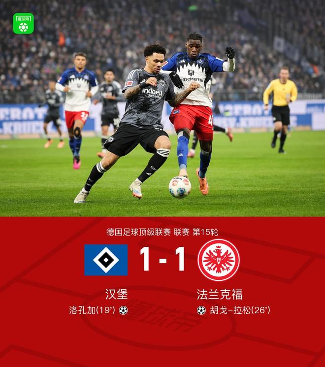 北京时间12月20日,德国顶级足球联赛第15轮比赛开赛。汉堡主场迎战法兰克福。比赛中,汉堡率先打破僵局,洛孔加成功破门,主队取得领先。此后,法兰克福得到纳撒尼尔·布朗助攻,乌戈·拉松破门扳平比分。此后双方均未能再次扳平比分,比赛最终汉堡与法兰克福1-1握手言和。关键赛事第18分钟,科林斯传球失误送礼,洛孔加低射破门,汉堡1-0法兰克福。第26分钟,布朗助攻,乌戈·拉尔森铲射破门扳平比分,法兰克福1-1汉堡。双方球员入场,比赛开始。第18分钟,科林斯传球失误送出大礼,洛孔加低射破门,汉堡1-0法兰克福。第26分钟,布朗助攻,雨果-拉尔森破门d铲平比分,法兰克福1-1汉堡。第59分钟,角球开出。可耐夫凌空抽射,将球勾出。费尔南德斯在边线将球扑出。第67分钟,克里斯滕森与穆海姆头部相撞失去知觉。经过治疗,双方都好了。第74分钟,达胡德外围尝试远射,皮球稍稍偏出。第80分钟,维埃拉越位,进球被判无效。球队阵容技术统计