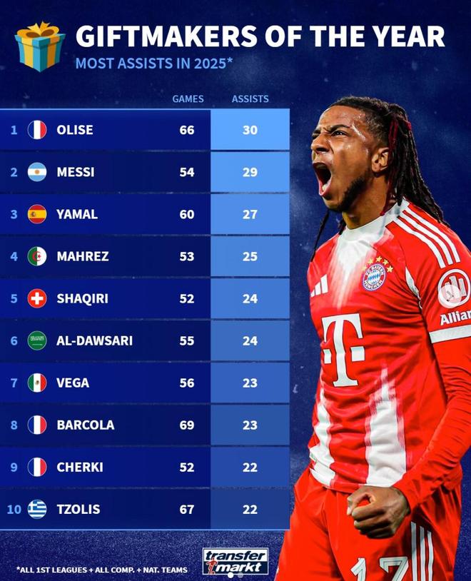 北京时间12月25日,德专盘点了2025年顶级足球联赛俱乐部+国家队各项赛事助攻数最多的10名球员。奥利塞以66场比赛30次助攻排名第一,梅西以54场比赛29次助攻排名第二,亚马尔以60场比赛27次助攻排名第三。 2025年德国俱乐部+国家队助攻数前10名球员: 1.奥利塞(法国/拜仁慕尼黑) 66场比赛,30次助攻 2.梅西(阿根廷/迈阿密国际) 54场比赛,29次助攻 3.亚马尔(西班牙/巴塞罗那) 60场比赛,27次助攻 国家队 4.马赫雷斯 27场助攻 5.沙奇里(瑞士/巴塞尔) 52 场 24 次助攻 6. 达瓦萨里(沙特阿拉伯/利雅得新月) 55 场 24 次助攻 7. 亚历克西斯·维加(墨西哥/托卢卡体育) 56 场 23 次助攻 8. 巴克拉(法国/巴黎圣日耳曼) 69 场法国/巴黎圣日耳曼) 舍基斯 . 52场22助攻 10.佐利斯(希腊/布鲁日)67场22助攻【咪咕独家观看英超】