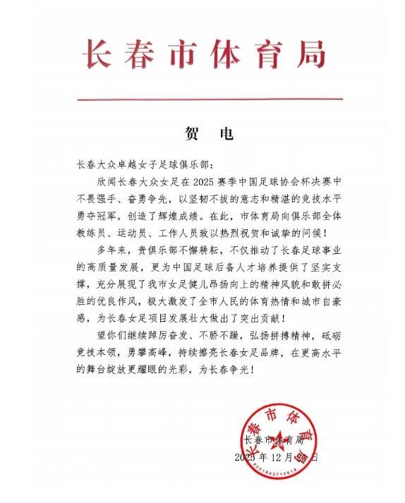 北京时间12月24日晚,2025年中国女足协会杯决赛中,长春大众优秀女足2-0击败广东女足,夺得冠军。随后,长春市体育局、长春市足协向表现优异的长春大众女足致以祝贺。长春市体育局向长春大众优秀女足俱乐部发来祝贺:很高兴听到长春大众女足不畏强敌,奋勇拼搏,晋级2025年中国足协杯决赛。他们凭借坚持不懈的精神和高水平的比赛赢得了冠军,创造了辉煌的成绩。在此,市体育局向g俱乐部全体教练员、运动员、工作人员致以热烈的问候和诚挚的祝贺!多年来,您的俱乐部不懈努力此举不仅推动了长春足球产业高质量发展,也为我国足球后备人才培养提供了坚实支撑。充分展示了我市女足敢拼必胜的昂扬精神和良好作风。极大激发了全市人民的体育热情和城市自豪感,为长春女足项目的发展壮大做出了突出贡献!希望你们继续努力,不骄不躁,弘扬拼搏精神,磨练竞技能力,勇攀高峰,继续打磨长春女足品牌,在更高水平的舞台上更加闪耀,为长春争光!长春市体育局长春市足协于2025年12月24日向长春大众优秀女子足球俱乐部发来贺电:很高兴听到贵队在联赛中不畏强敌近日落下帷幕的2025年中国太平中国足协杯(女足)决赛,在我市赢得了坚持,赢得了坚持,在我市夺得了冠军。在此,我会向贵会全体会员致以热烈的问候!谨向长春足球姑娘们的辛勤付出表示诚挚的祝贺和衷心的感谢!赛场上,你们默默配合,不言放弃,用自己的汗水和毅力为长春这座城市增添了光彩。你们是长春的骄傲!希望贵俱乐部再接再厉,继续弘扬长春女足“响亮的玫瑰”拼搏精神,取得更大的成功,为我市足球产业高质量发展乃至中国足球的复兴发展做出新的贡献!长春足协 2025年12月24日